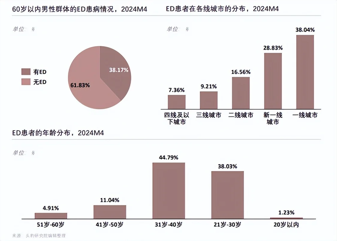 在经济增速换挡、社会节奏加快的时代背景下,中国 90 后正处于人生压力的最密集点——他们成为家庭经济支柱、职场核心力量、育儿主力,而长期透支的生活方式使“亚健康”成为普遍问题。与以往不同的是,健康危机不再只集中于中老年群体,男性性健康问题正以前所未有的速度向年轻群体蔓延。根据头豹研究院联合发布的《2024 年中国抗 ED 药物行业白皮书》显示,30 至 40 岁男性的 ED 患病率高达 44.79%,几乎占据中青年男性的一半。这一数据意味着,ED 正在成为一项被低估的社会性健康议题,与婚姻质量、心理状态、家庭关系密切相关。