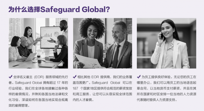 Safeguard Global 2008年创立于英国,是名义雇主(EOR)服务开创者,深耕全球雇佣外包18年,为出海企业提供全流程合规用工支持,是欧洲市场综合实力领 先的人力资源服务商。