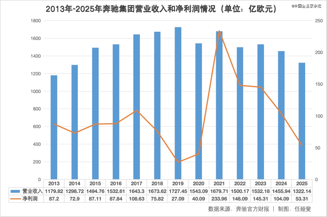 梅赛德斯-奔驰集团发布的2025年全年业绩显示,集团2025财年营收为1322.14亿欧元,同比下滑9.2%;净利润为53.31亿欧元,同比降幅达48.8%,几乎腰斩;调整后息税前利润为82亿欧元,同比下降约40%;工业业务自由现金流54亿欧元,即使自由现金流保持正向,但也远低于上一年的近92亿欧元。