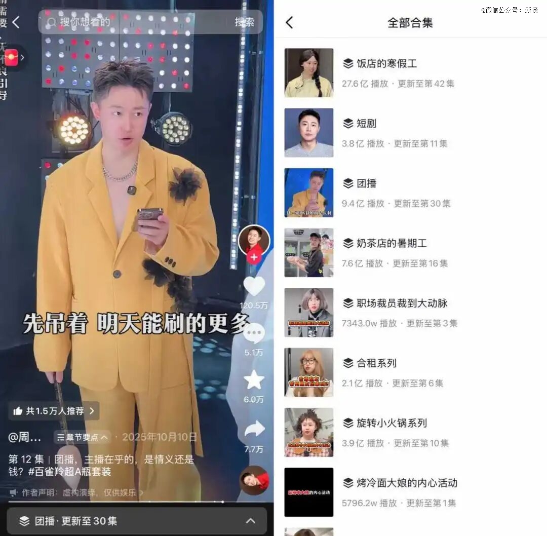 一时间,“拆穿博主拍摄套路”成为了“周小闹”的热门主题,从情侣博主靠剧本、探店博主造假,到行业内幕,他都一一呈现,仅《团播》一个系列的视频,在抖音的累计播放量就超9.4亿次。
