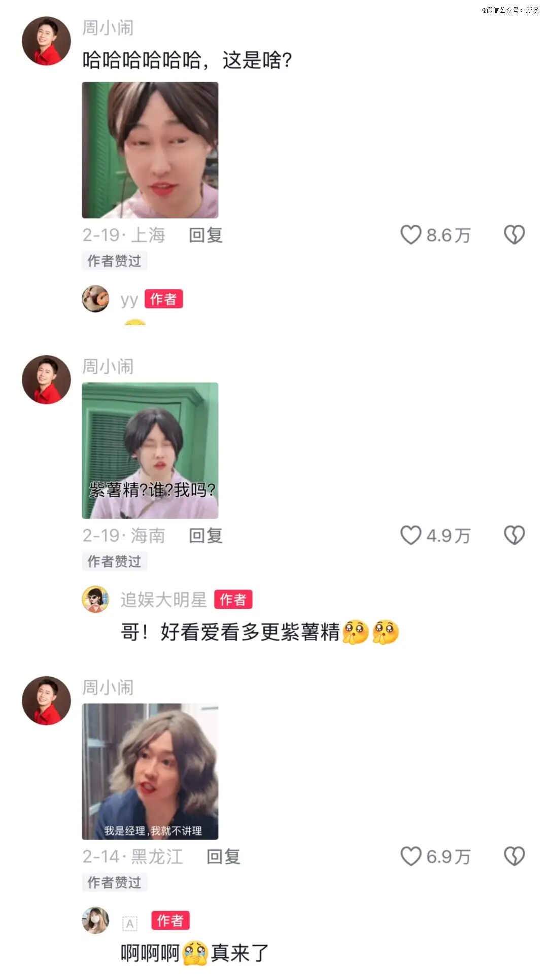 就连紫薯精背后的男人“周小闹”都在评论区回应,称刘文祥没给广告费,有联系合作,但“不想视频变味,也不想刘文祥变味,就让紫薯精在剧情里好好爱刘文祥吧”。