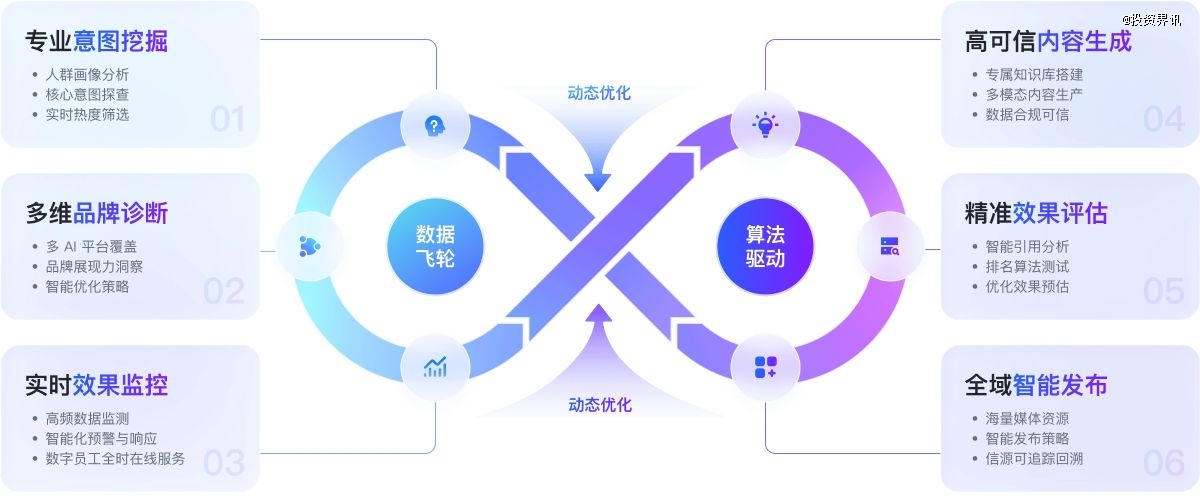 围绕全链路GEO流程,Mark 可提供六大核心能力服务,实现AI口碑营销全流程智能化闭环管理:通过专业意图挖掘锁定高转化用户需求;根据多维品牌诊断输出全维度优化方案;一键专属知识库搭建帮助生成高可信内容;精准效果预估提前锁定投放价值;全域智能发布匹配高权重可信信源;实时效果监控实现7×24小时动态监测分析。