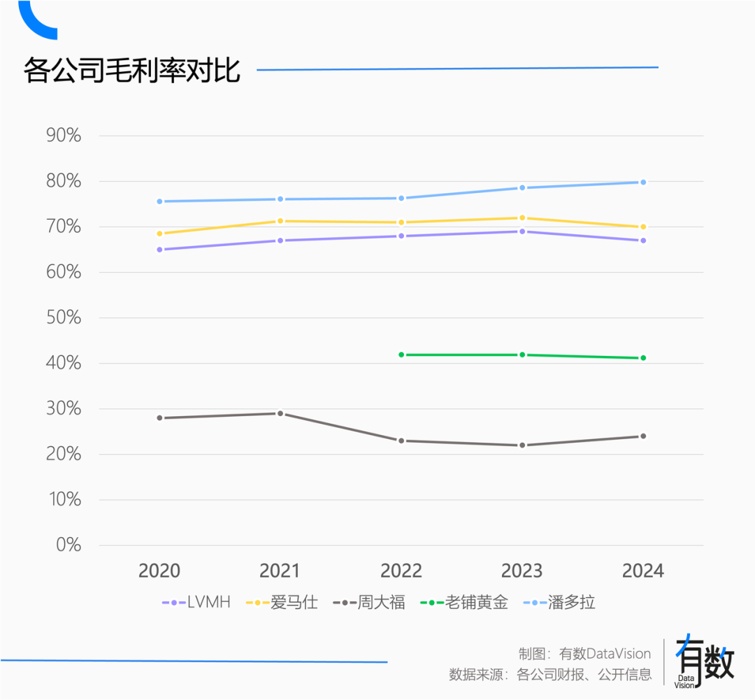银饰品牌潘多拉的毛利率长期稳定在75%以上,一度接近80%,不仅金饰和钻石难望其项背,奢侈品品牌也甘拜下风。