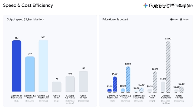 此外,对比市面同等轻量级模型,如GPT-5 mini、Claude 4.5 Haiku,无论是速度还是成本,Gemini 3.1 Flash-Lite都优势显著。