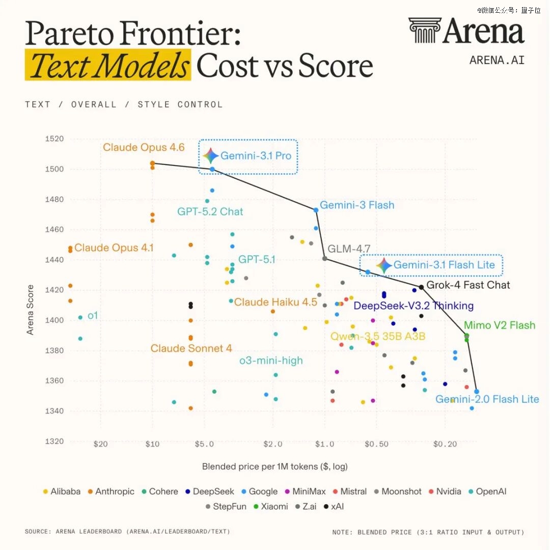 而Gemini-3.1 Pro则持续在高价位型号中保持*梯队,Gemini 3 Flash处于二者之间。