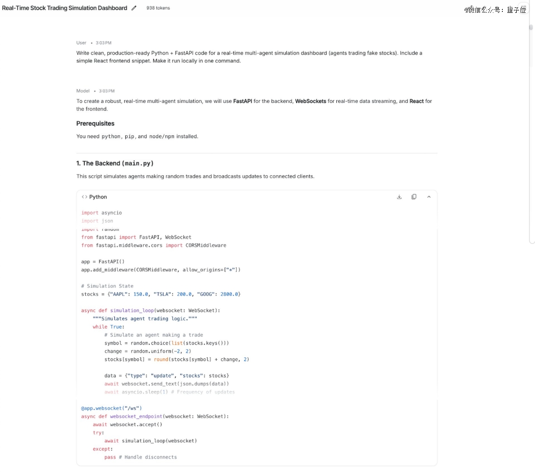 在编程测试中,Gemini 3.1 Flash-Lite输出简洁直接,没有做复杂的项目拆分,以单文件实现了核心后端功能,可快速运行,无冗余内容。