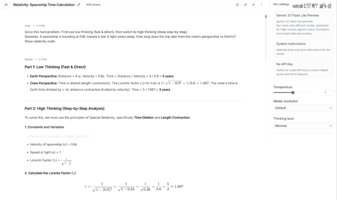 Gemini 3.1 Flash-Lite正确使用了复杂物理学公式,回复结构也很完整,先给简要结论,再进行明确的数学推导。
