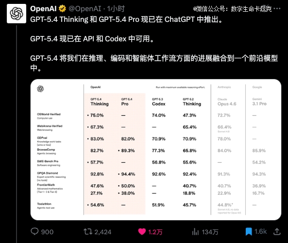 GPT-5.4 = GPT-5.3 Codex的代码能力 + 比GPT-5.2还强的世界知识 + 更强的工具使用能力 + 超级便宜的codex额度。