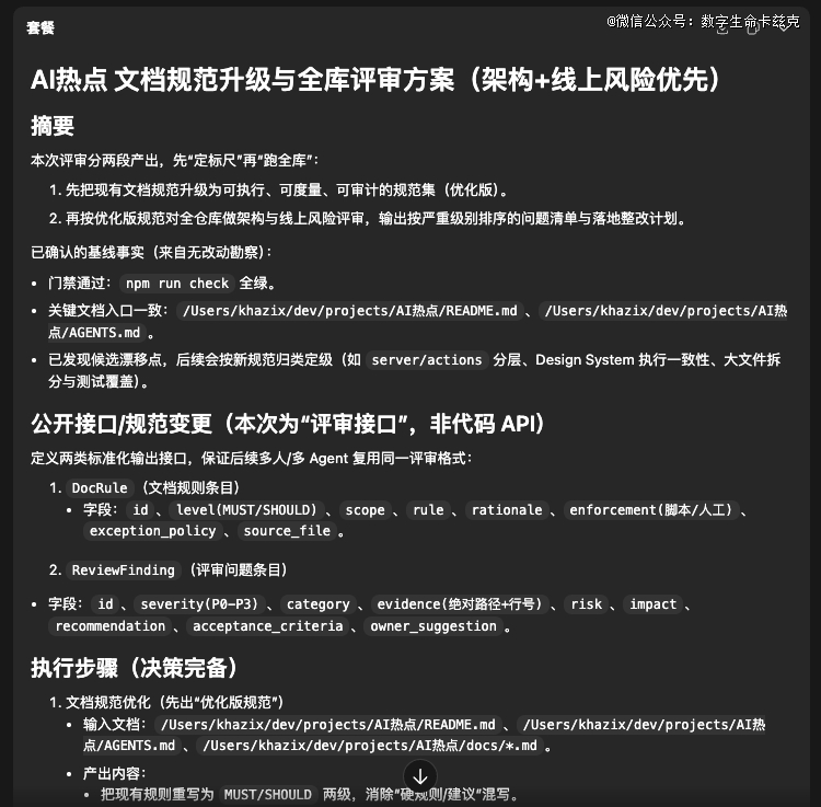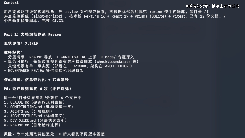 就比如说,我让他之前对我的一个AI热点网站的项目进行审查,主要就是review一下我的文档规范和我整个代码库。