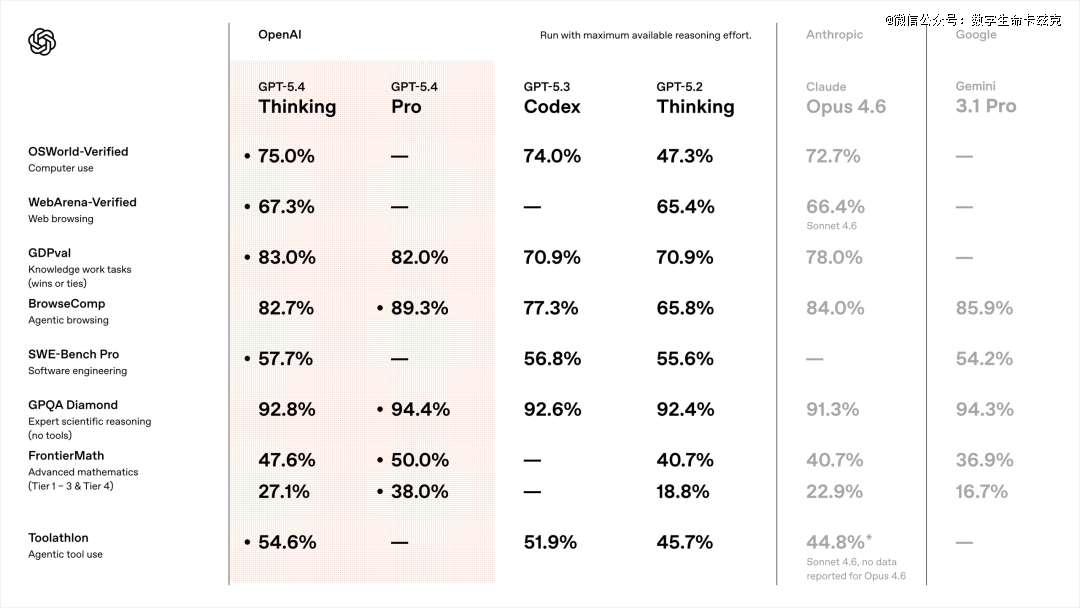 GPT-5.4 Thinking拿了75.0%,超过了Claude Opus 4.6的72.7%,也保持了跟GPT-5.3-Codex的持平。