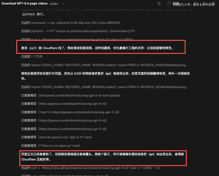 比如我让它去把OpenAI官网的视频给扒拉下来,你看看这个发言:“这种活最烦”,“省的跟Cloudflare互相折寿”。。。