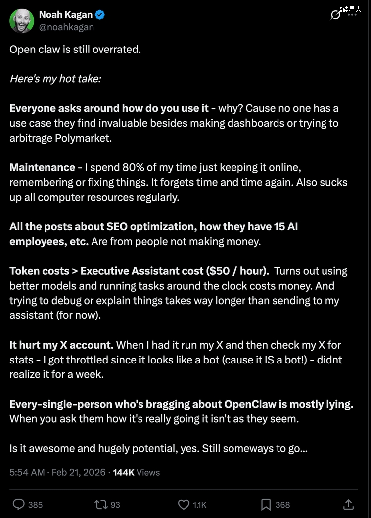 海外的冷静反思其实已经开始了。不少深度使用过OpenClaw的人发现,这东西目前还远没有社交媒体上吹的那么神。有人连续用了十天、花了400美元token费,最后的结论是:它并没有减少人的工作量,只是把工作内容从“执行”变成了“看管”。