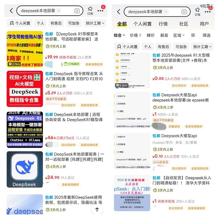 再往回看几个月。2025年春节前后DeepSeek爆火出圈,闲鱼上立刻涌现出从几毛钱到上千元不等的付费内容。有人在闲鱼花0.88元买了一套教程,加了卖家微信,收到一个网盘链接,卖家坦言自己只是靠网盘拉新赚钱,用户每次下载他能拿5块奖励。知识星球上,一个叫“用DeepSeek实战高效赚小钱”的社群4天涌入4000人,按62元一位算,入账近25万。