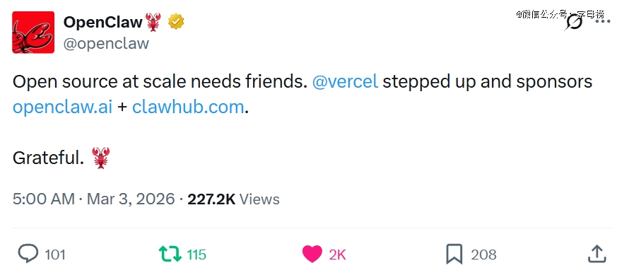 OpenClaw官方发了这么一条X,说大规模的开源需要伙伴,于是Vercel站出来帮助了OpenClaw以及Clawhub。大家的*反应普遍都是“Vercel是谁”?