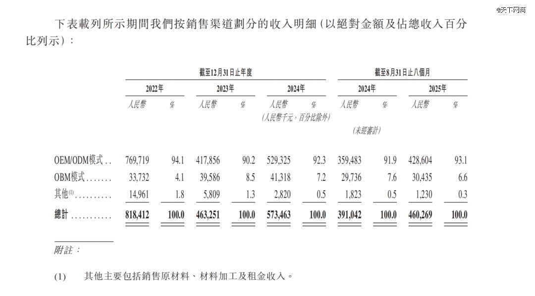 招股书显示,报告期内(2022年、2023年、2024年和2025年前8个月),乐欣户外OEM(原始设备制造)/ODM(原始设计制造)模式的收入占比始终维持在90%以上,最高时达到94.1%。