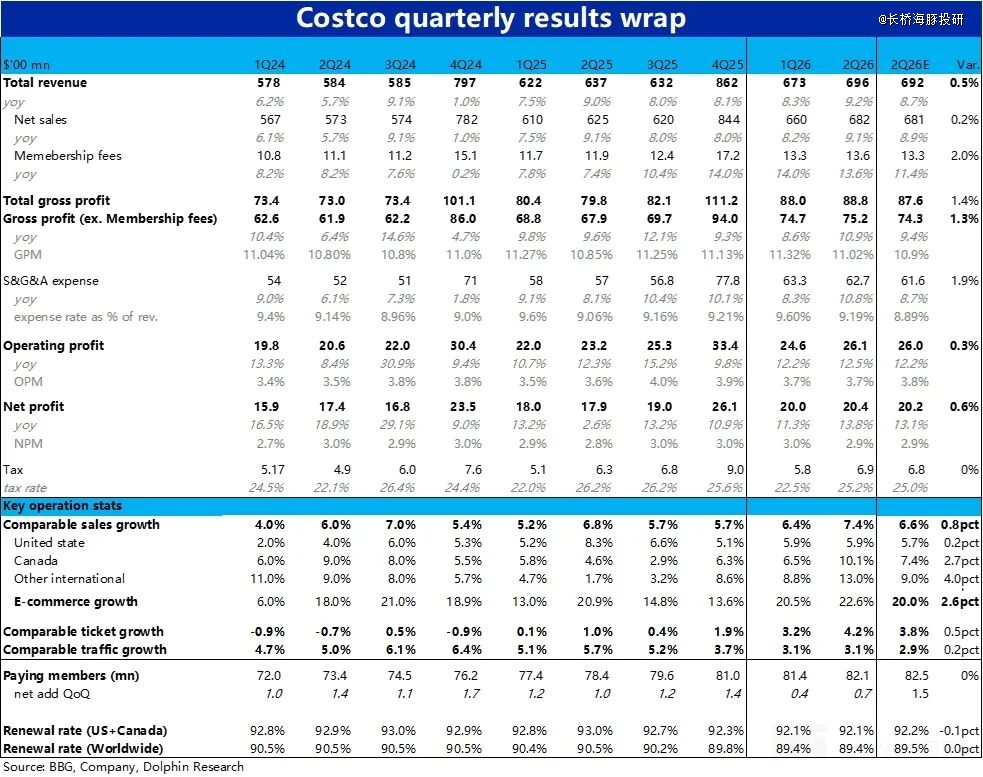 全球折扣零售*—开市客(COST.US) 今早美股盘后,发布了截至 2 月 15 日的 2026 财年 2 季度财报。整体来看,业绩依然稳健,营收和利润都稍好于预期。具体来看: