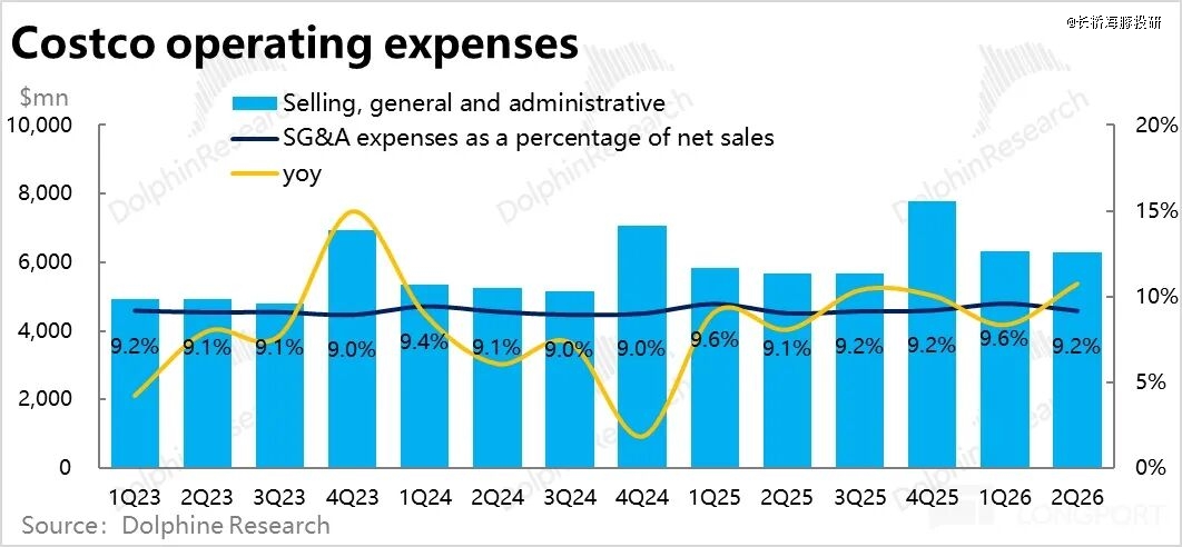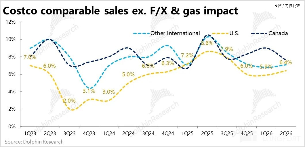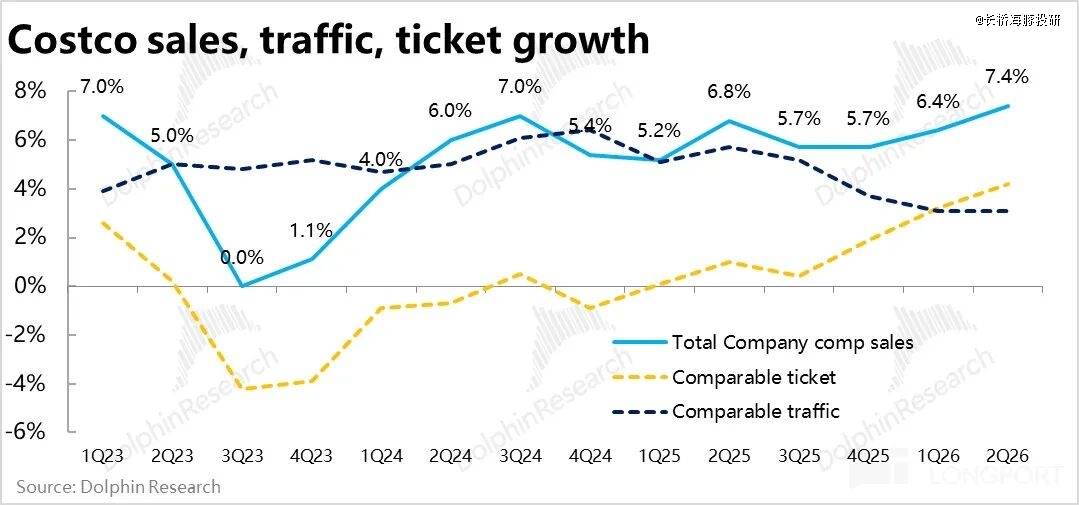 核心经营指标上,Costco 本季度整体同店销售增速为 7.4%,比上季的 6.4% 明显提速,也好于市场预期。不过分价量驱动因素来看,同店客流量增速实际环比持平在 3.1%,并未提速。主要是靠客单价走高拉动的增长,本季增长 4.2% vs. 上季的 3.2%。