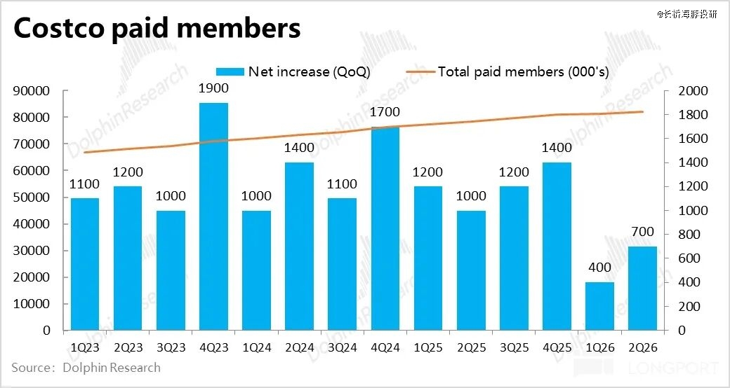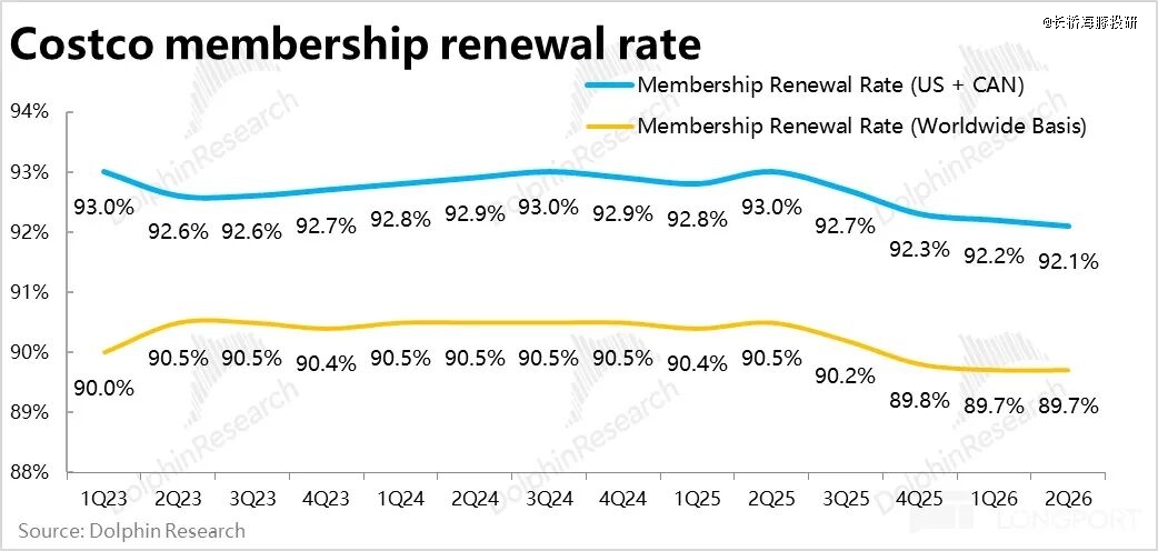 根据公司先前的解释,续费率持续下滑、以及付费会员增长还是偏弱,主要是疫情后,Costco 通过线上渠道或者折扣渠道,拓展了大量非 Costco 核心目标客群的新用户,因此拖累了续费率。