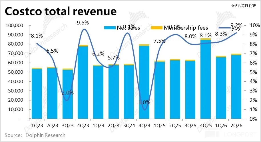 1、汇总以上零售收入和会费收入,本季 Costco 实现总收入$696 亿,同比增长 9.2%,环比有所提速且好于市场预期。