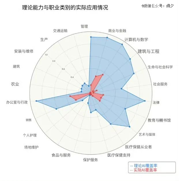 其实Anthropic的报告写得很清楚,AI在各行各业的理论利用率「蓝色区域」和实际利用率「红色区域」相差甚远: