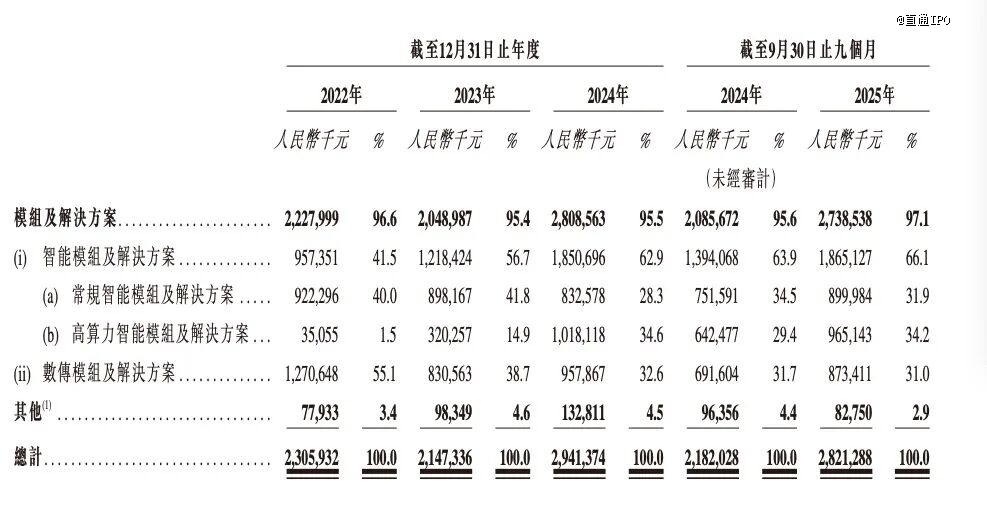 于往绩记录期间,模组及解决方案的收入占各期收入比例高达96.6%、95.4%、95.5%和97.1%,可具体分为智能模组及解決方案、常规智能模组及解決方案、高算力智能模组及解決方案以及数传模组及解决方案。
