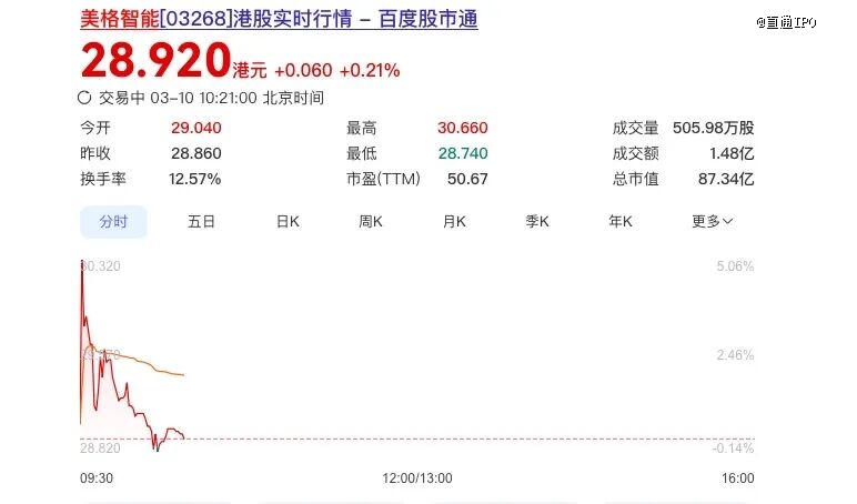 3月10日,美格智能技术股份有限公司(简称:美格智能)正式登陆港交所,发行价为28.86港元/股,开盘价为29.04港元/股,随后最高冲至30.66港元/股,然后有所滑落。截至10:21分,公司股价为28.92港元/股,市值87.34亿港元(约合76.5亿元)。