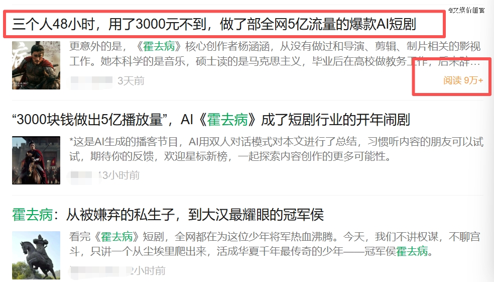 这周,《霍去病》的相关话题登上热搜。有报道称,这部80集的AI短剧,制作团队只有3人,仅耗费48小时且不到3000元成本,就做出一部全网播放量破5亿的AI短剧。