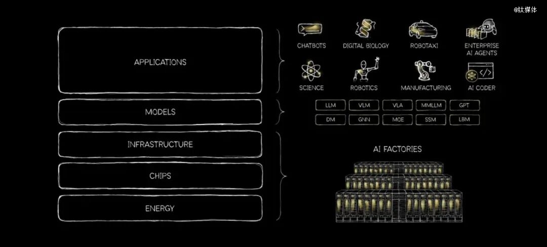 黄仁勋的核心洞察是:计算的本质已发生根本逆转。过去几十年,软件是“预制”的——人类写代码,计算机执行检索。如今AI是“实时生成智能”,能理解、推理、并根据情境动态回应。这意味着整个计算栈必须被重构。由此,他提出了“五层蛋糕”产业模型:能源→芯片→基础设施(AI工厂)→模型→应用。