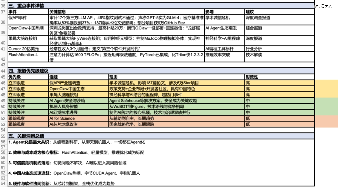 最终,它综合了文件夹内 6 个文档,输出了一份包含十大核心趋势、热点事件概括、重点事件关键信息及报道优先级建议的分析报告。