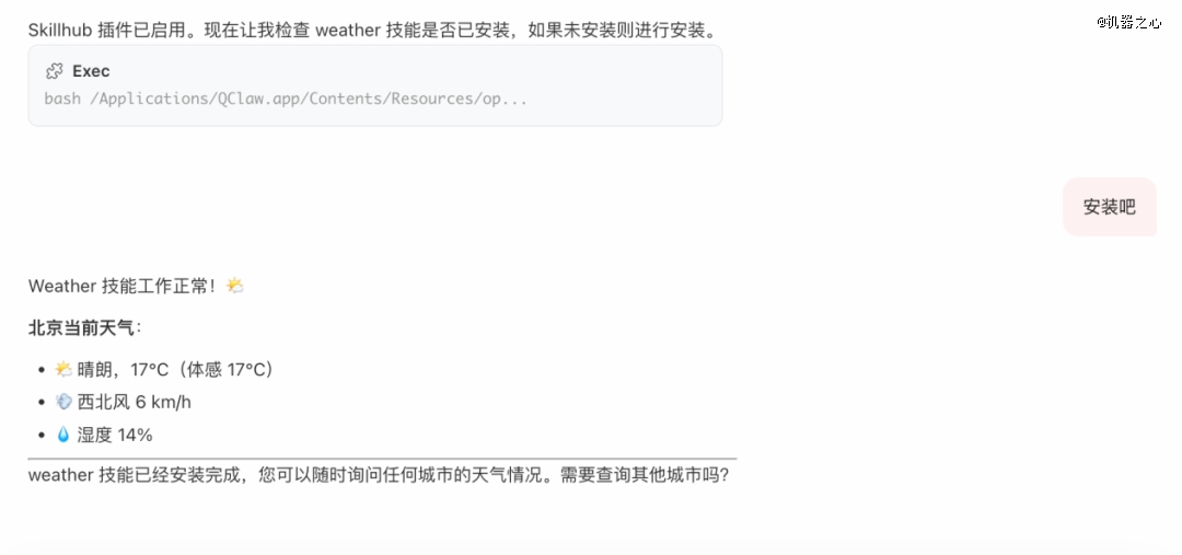 我们先尝试了一个简单的 Skill—— 天气,效果如下: