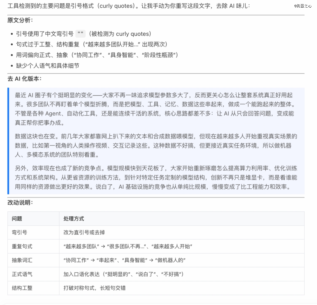 接下来,我们又尝试了「humanizer」技能,这个技能主要用于润色文本,去掉其中的 AI 味儿,运行效果如下: