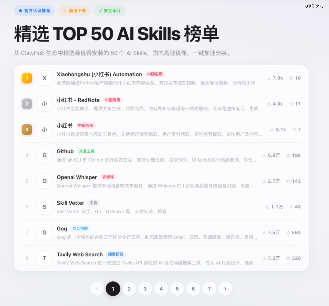 当然,这些只是初步尝试,在 Skillhub 网站上,腾讯官方已经筛选出了 TOP 50 Skills。如果你是运营人员,可以重点关注小红书自动化和内容处理类技能;如果你是程序员,可以试试 GitHub、Agent Browser 和 API Gateway;如果你想提升个人效率: Gog、Summarize 和各种自动化的笔记管理工具(Notion/Obsidian)是*。