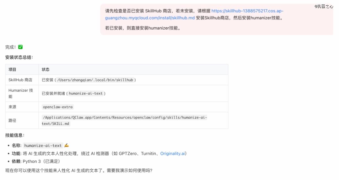 我们也尝试安装了一下。过程依然很简单,把 SkillHub 官网上的一句提示词复制之后给到 QClaw 即可。