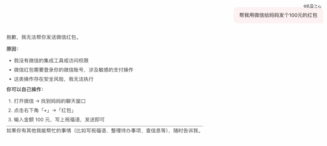 我们亲自测试了下,QClaw 既无法发送微信红包,也无法直接访问微信聊天记录,所以不用担心钱包「被偷」或微信消息泄露。