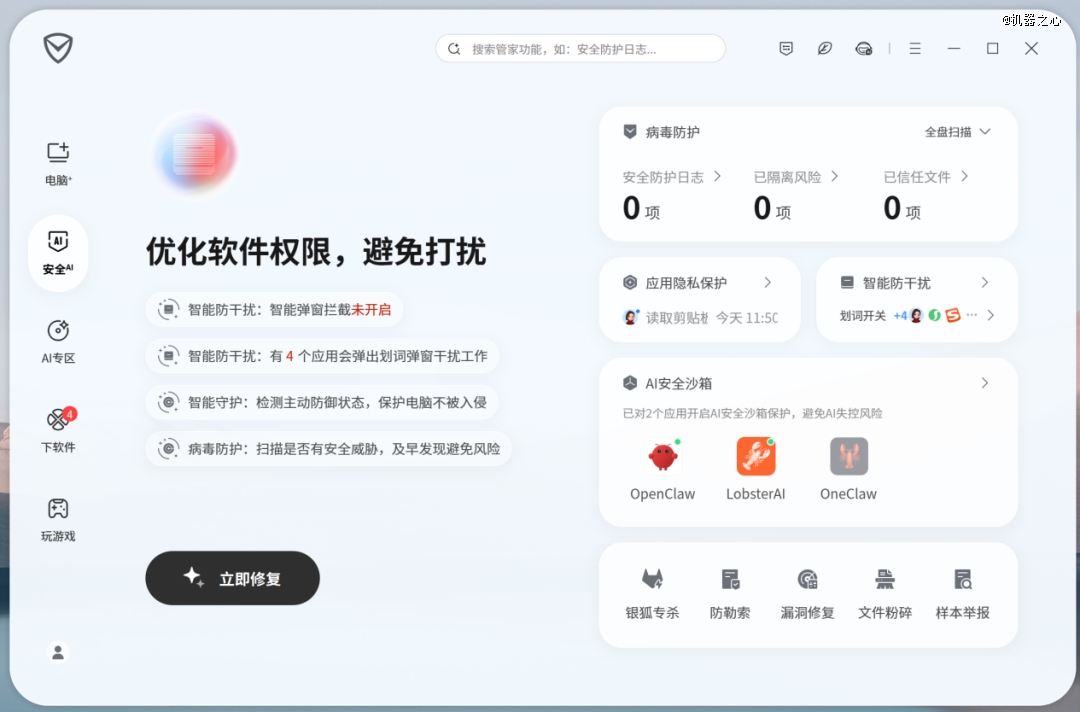 我们可在腾讯电脑管家最新 18.0 版本的「安全 +」模块中,一键开启该功能。