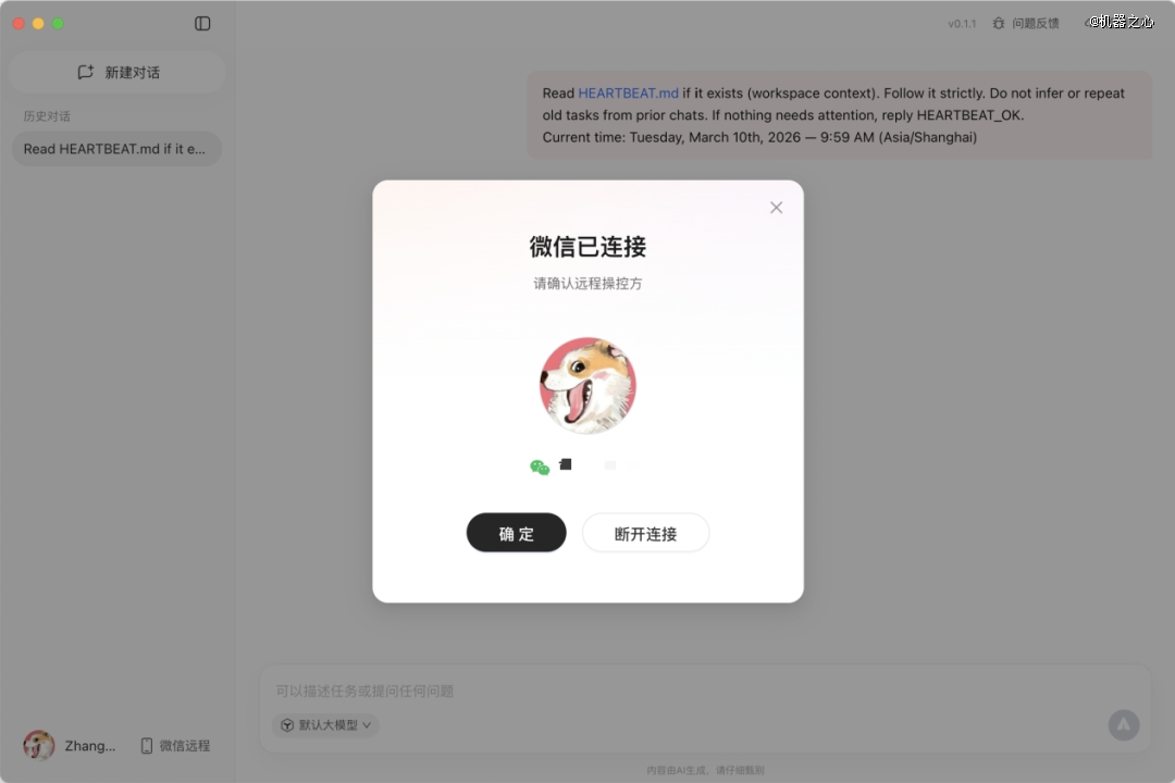 QClaw 还集成了微信,我们只要在聊天窗口发送指令,就能远程操控电脑,例如整理文件、执行自动化任务。