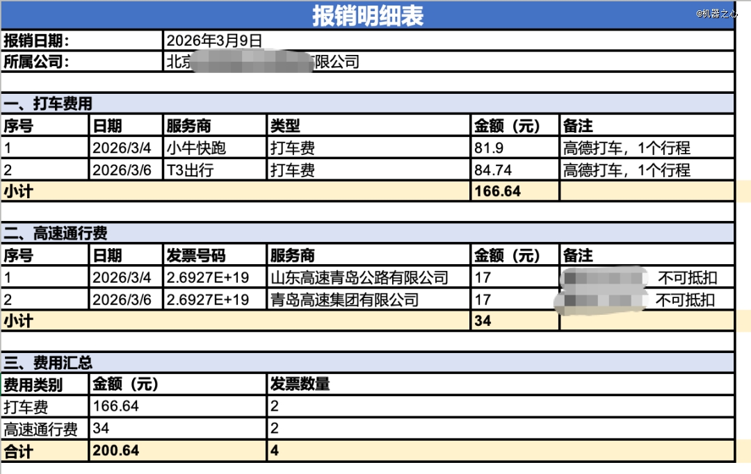 可以看到,QClaw 整理的报销明细表条理清晰,打车服务商、金额、高速通行费以及费用汇总一目了然,省去了我们手动操作的麻烦。