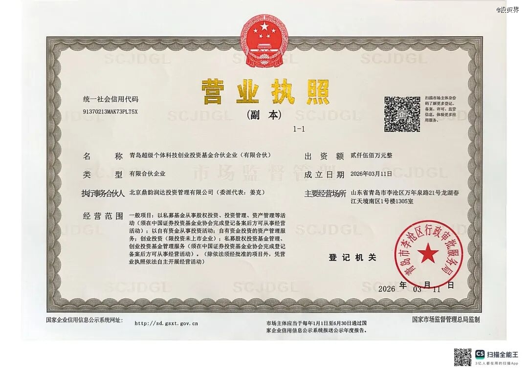投资界(ID:pedaily2012)消息,3 月 11 日,青岛超级个体科技创业投资基金合伙企业(有限合伙)正式取得营业执照,标志着规模达 5000 万元(第一期2500万元)的青岛首支 AI-OPC 科创基金宣告成立。这支由春峰里资本联合柠檬豆发起,携手深圳中欧资本技术专家,依托OPIE 平台筛选优质OPC 项目,将与“OPC 未来之星 100 行动” 形成合力,为青岛 “单人 + AI” 创业生态构建全链条支撑体系。