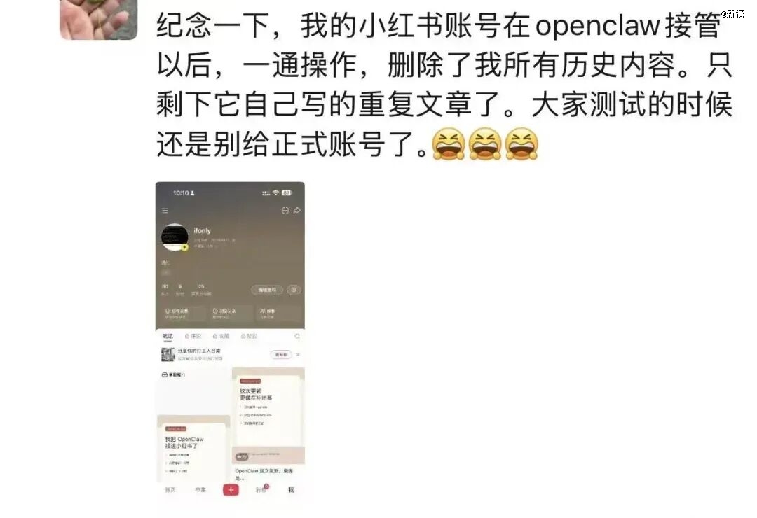 有网友表示自己将小红书账号交给龙虾托管后,账号中的历史内容全部被删,账号几乎废掉。还有网友认为,创作者必须考虑,AI托管账号如果不幸触犯法律法规,自己该如何解决。3月10日,国家互联网应急中心也发文提醒,建议相关单位和个人用户在部署和应用OpenClaw时需采取安全措施。