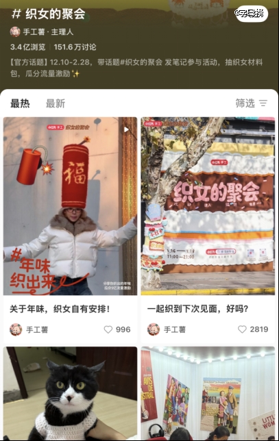 在国内,抖音上“手工编织”话题播放量高达234亿;小红书“织女日常”词条已经有700万+讨论、13.6亿浏览量,比较新的“织女的聚会”词条也有3.4亿浏览量。