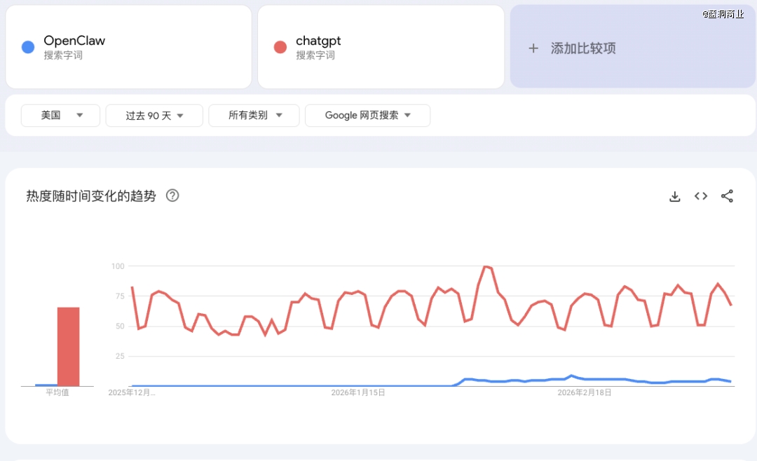 检索谷歌指数,你会发现美国市场的 OpenClaw 在过去 90 天的热度有所增长,但相比 ChatGPT的热度来说,OpenClaw 的热度只有十分之一甚至更低。