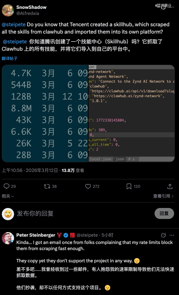 腾讯近日上线了 AI 技能社区 SkillHub,但OpenClaw 创始人在社交媒体上公开批评腾讯,因为「他们抄袭,却不以任何方式支持这个项目」。