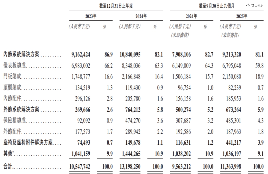 具体来看,2023年、2024年、2025年1-9月(简称“报告期”),新泉股份超过80%的收入来自内饰系统解决方案,其中,仪表板总成贡献了约60%的收入,门板总成的收入占比在16%左右。