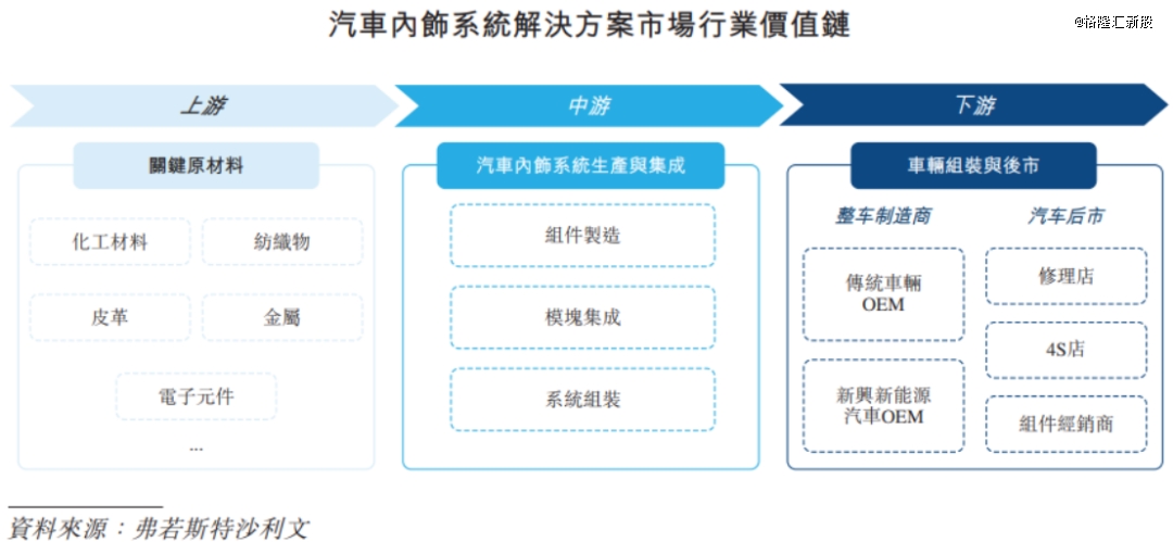汽车内饰产业链上游主要为原材料供应,包括化工材料、纺织物、皮革及电子元件,作为制造内饰部件的基材及填充物。