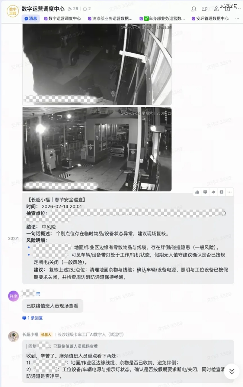 春节期间,他让龙虾接上工厂摄像头在线值班,发现问题直接在飞书群里通报、联络值班人员现场处置。