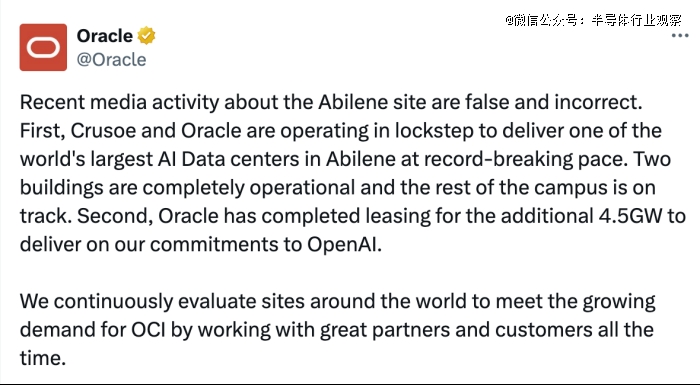 「关于阿比林(Abilene)基地的近期媒体报道是虚假且不准确的。首先,Crusoe 和甲骨文(Oracle)正步调一致地合作,以打破纪录的速度在阿比林交付全球*的 AI 数据中心之一。目前两栋建筑已投入运营,园区的其余部分也正按计划推进。其次,甲骨文已经完成了额外 4.5GW 电力的租赁,以履行我们对 OpenAI 的承诺。
