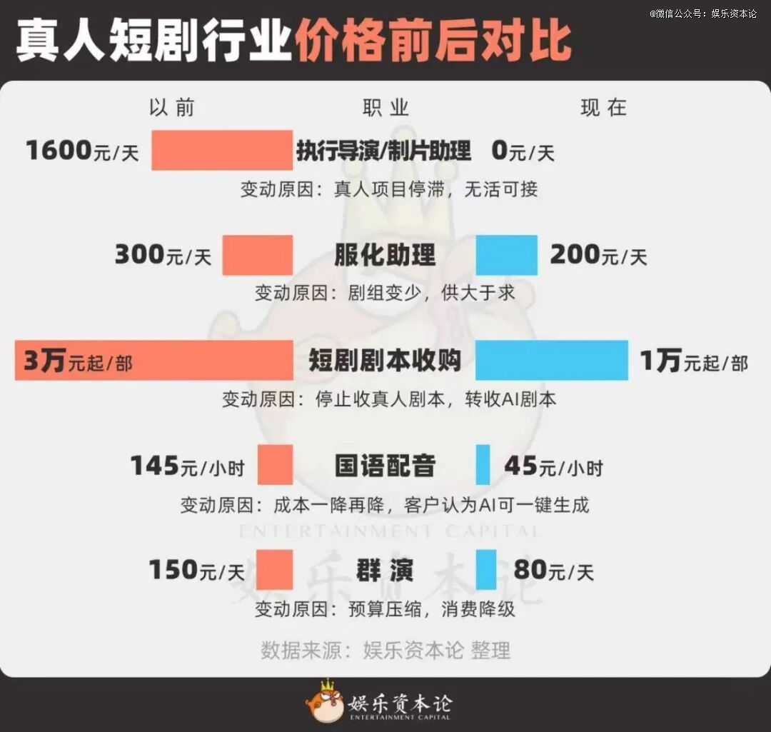 更残酷的是,编剧的剧本收购价从3万元跌到1万元,配音价格从140元/小时被压到45元,就连群演日薪也从150元腰斩至80元。这场由AI掀起的行业风暴,正以惊人的速度,卷走真金白银,也卷走无数人的饭碗。