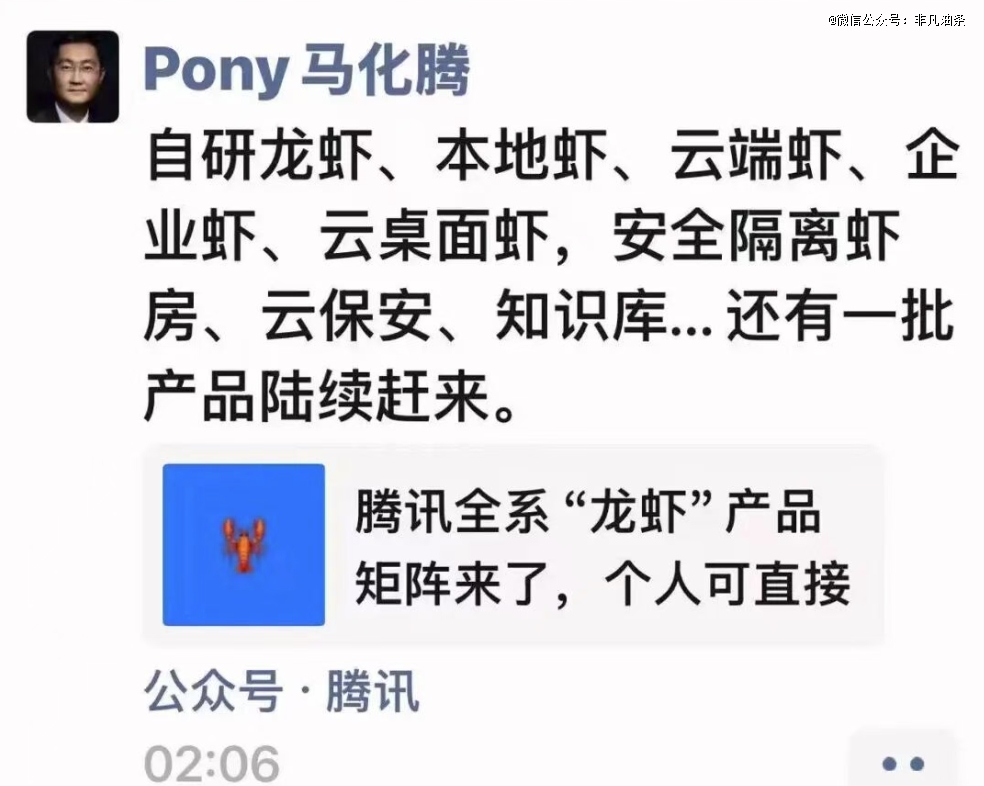 一个小龙虾不够,马化腾还连夜发朋友圈,“自研龙虾、本地虾、云端虾、企业虾、云桌面虾,安全隔离虾房、云保安、知识库”都会来。