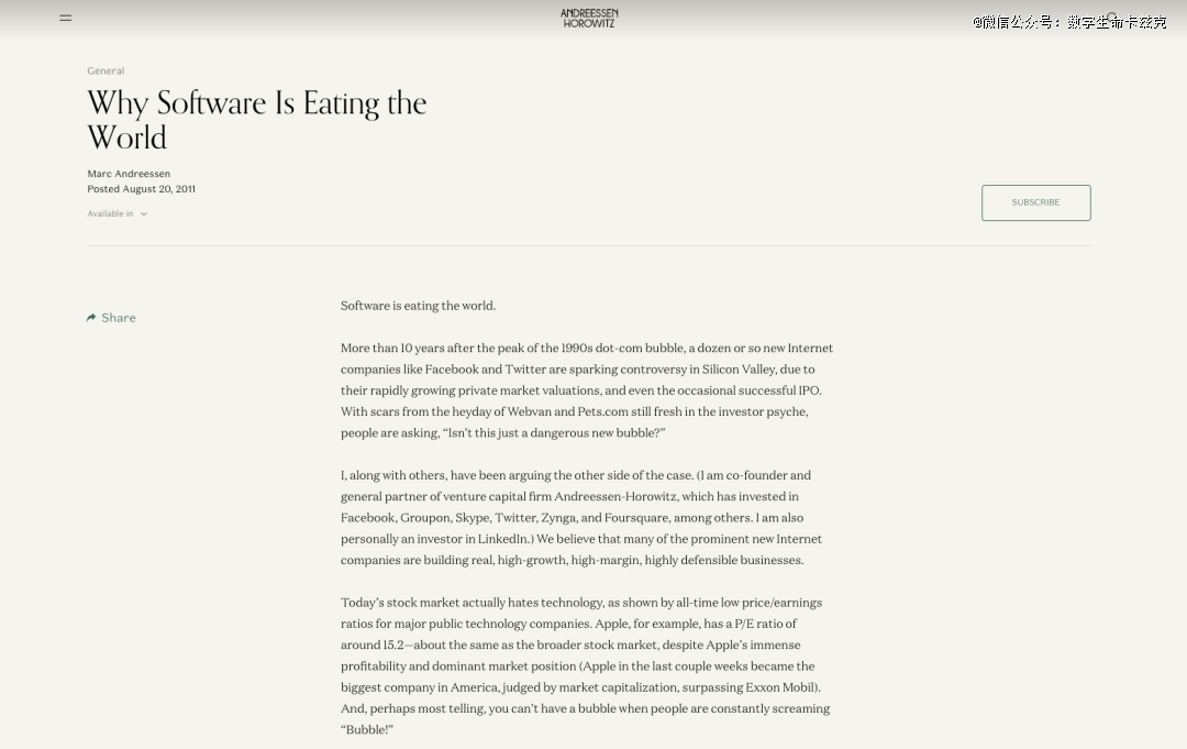 这句话对应的,其实是2011年8月20号,Marc Andreessen在发布的那一篇著名的文章。