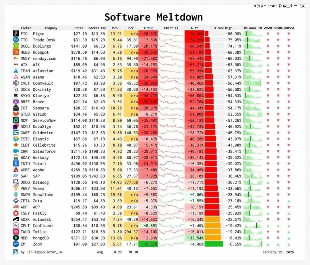 之前看到一张图,数据截止到今年1月底,绝大多数的SaaS股票,较其52周高点,都下跌了30%-80%不等。